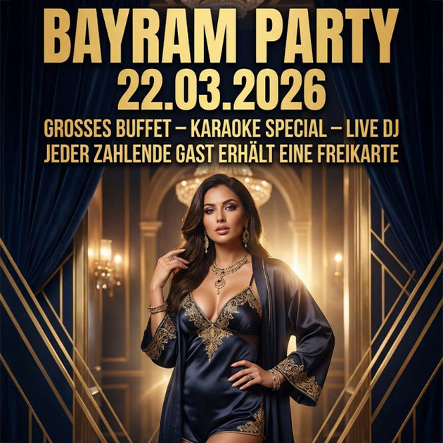 Eventankündigung: Im Club Mondial ist es Zeit fiür die nächste "Bayram Party". Stattfinden soll sie am Sonntag, den 22. März 2026. Dabei werden den Gästen wieder viele Highlights geboten: Genau wie beim letzten Mal ist auch zur Bayram Party wieder ein Live-Dj anwesend, der für ausgelassene Stimmung sorgt. Lust auf ein schmackhaftes Buffet, ein Karaoke Special und spannende Kontakte zu den anderen Partygästen?