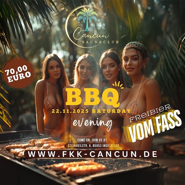 Am Samstag, den 22. November wird der Grill angeworfen und der Cancun Saunaclub lädt seine Gäste zum BBQ Saturday Grill ein! Eine schöne Tradition, bei der Männlein und Weiblein bei Grillgut und Freibier zusammenkommen, leckere Speisen verzehren und den Abend in netter Atmosphäre genießen können. Der Eintritt beträgt 70 Euro.