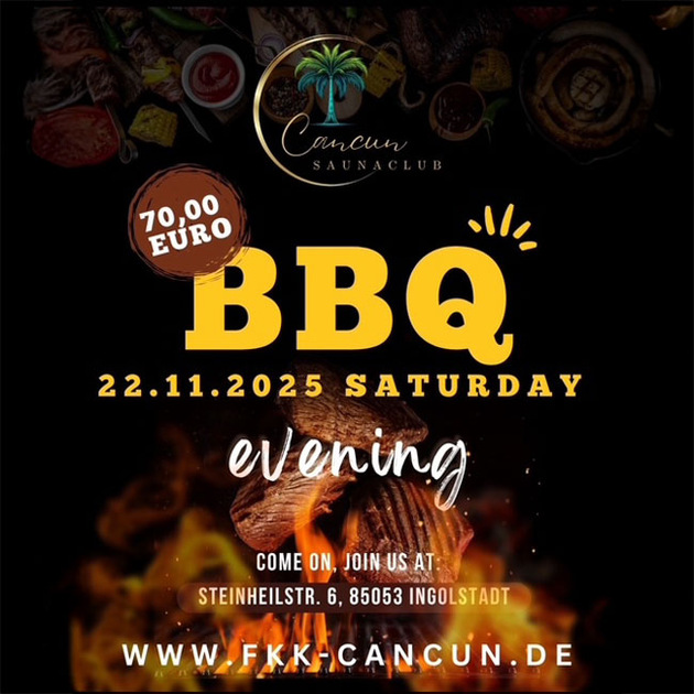 Eventankündigung: Am Samstag, den 22. November wird der Grill angeworfen und der Cancun Saunaclub lädt seine Gäste zum BBQ Saturday Grill ein! Eine schöne Tradition, bei der Männlein und Weiblein bei Grillgut und Freibier zusammenkommen, leckere Speisen verzehren und den Abend in netter Atmosphäre genießen können. Der Eintritt beträgt 70 Euro.