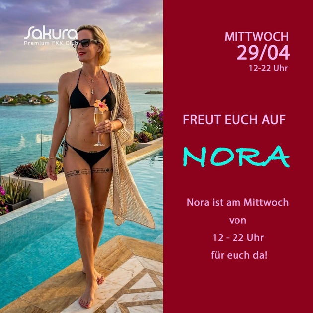 Am Mittwoch, den 29. April 2026 ist die attraktive Nora im Sakura FKK! Von 12:00 bis 22:00 Uhr zeigt sie nicht nur, was sie zu bieten hat, die schlanke Blondine lädt außerdem gerne zum erotischen Stelldichein! Das sollte man(n) sich nicht entgehen lassen!