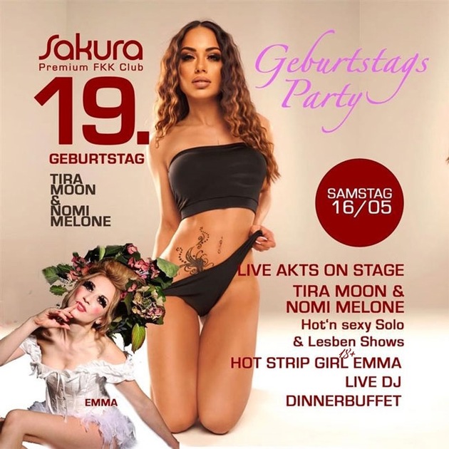 Eventankündigung: Jetzt wird wieder Geburtstag gefeiert, denn das FKK Sakura wird nun bereits 19 Jahre alt und ist somit offiziell volljährig! Den Gästen des Clubs zeigt er sich am Samstag, den 16. Mai 2026 ganz offiziell mit einer großen Geburtstagsparty von seiner schönsten Seite. Viele Überraschungen und ein tolles Rahmenprogramm sorgen an diesem Abend für abwechslungsreiches Entertainment. Neben einem Live DJ tritt Hot Strip Girl (18+) Emma auf und verzaubert mit lasziven Bewegungen.