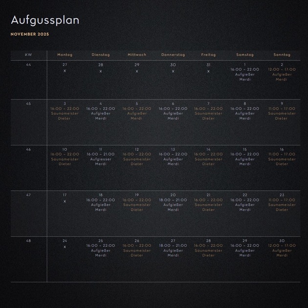 Auch im November lädt die Sauna des FKK Sharks wieder zu wohligem Schwitzen ein. Ein Blick auf die Grafik verrät die aktuellen Aufgusstermine von Sauna-Aufgussmeister Dieter und Aufgießer Merdi.