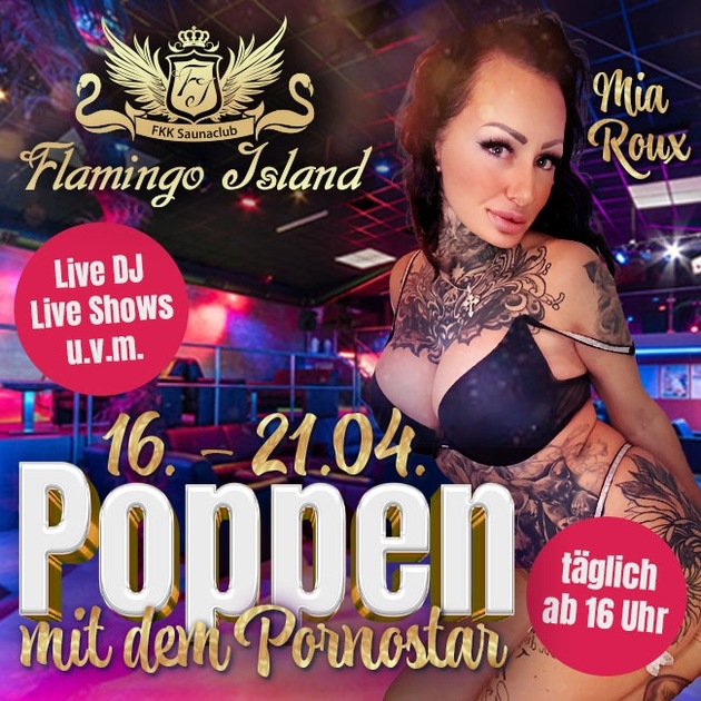 Eventankündigung: Die Tage von Donnerstag, den 16.04. bis Dienstag, den 21.04.2026 sollte man(n) sich rot im Kalender anstreichen! Denn dann gibt sich im Flamingo Island die attraktive Porno-Actrice Mia Roux die Ehre und offeriert den Gästen neben heißer Live-Shows inklusiver tiefer Einblicke noch Einiges mehr! Kurz gesagt, dann heißt es für den geneigten Besucher: P*ppen mit dem Porno-Star, das wird geil, na klar!