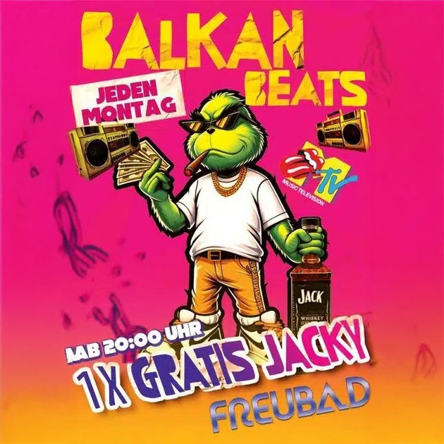 Jeden Montag verwandelt sich das Freubad in die heißeste Location der Stadt – bei einer Party mit Balkan Beats! Alle Gäste erhalten ab 20:00 Uhr ein Glas Jacky gratis und für beste Stimmung sorgt ein Live-DJ mit den angesagtesten Balkan-Beats. Ein Abend voller Musik, Stimmung und guter Laune – nur im Freubad!