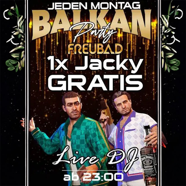 Jeden Montag verwandelt sich das Freubad in die heißeste Location der Stadt – bei der legendären Balkan Party! Alle Gäste erhalten ein Glas Jacky gratis und für beste Stimmung sorgt ein Live-DJ ab 23:00 Uhr mit den angesagtesten Balkan-Beats. Ein Abend voller Musik, Stimmung und guter Laune – nur im Freubad!