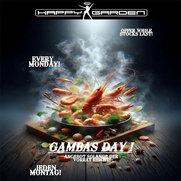 Jeden Montag ist im Happy Garden Gambas Day! Wie der Name schon sagt können sich die Gäste dabei an leckeren Gambas erfreuen, natürlich nur solange der Vorrat reicht.