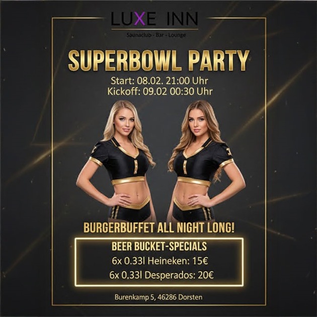 Das LUXE INN lädt zur exklusiven Superbowl Party ein und verspricht eine Nacht voller Sport, Genuss und Atmosphäre. Ab dem 08.02.2026 um 21:00 Uhr beginnt das Event, der Kickoff des Superbowls folgt in der Nacht zum 09.02.2026 um 00:30 Uhr. Die Gäste erwartet ein Burgerbuffet die ganze Nacht, begleitet von attraktiven Beer-Bucket-Specials: Sechs Heineken (0,33 l) für 15 € oder sechs Desperados (0,33 l) für 20 €. In stilvollem Ambiente verbindet das LUXE INN Sporthighlight und Lounge-Feeling zu einem besonderen Erlebnis.