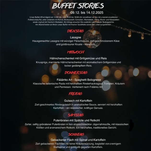 Welche Kulinarik man als Gast vom 09. bis zum 14. Dezember 2025 im Club erleben und genießen darf, das erfährt man auf der Grafik der Buffet Stories! Da kann man nur noch Guten Appetit wünschen!
