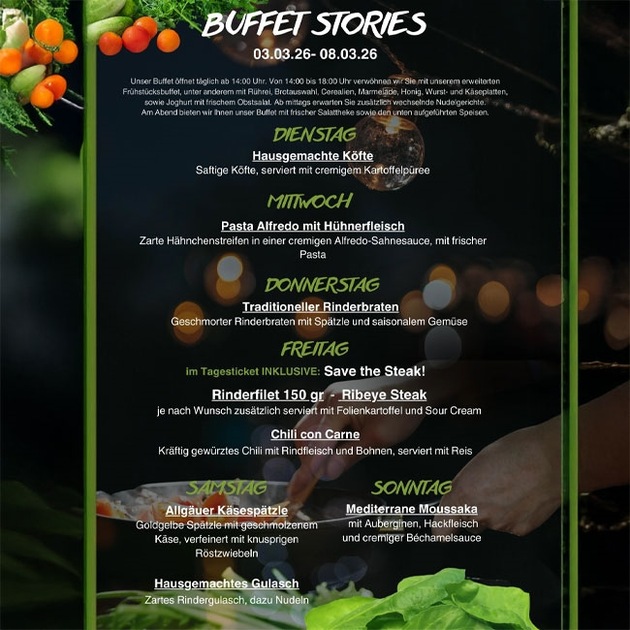 Welche Kulinarik man als Gast vom 03. bis zum 08. März 2026 im Club erleben und genießen darf, das erfährt man auf der Grafik der Buffet Stories! Da kann man nur noch Guten Appetit wünschen!
