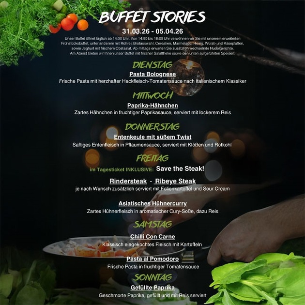 Welche Kulinarik man als Gast vom 31.03. bis zum 05. April 2026 im Club erleben und genießen darf, das erfährt man auf der Grafik der Buffet Stories! Da kann man nur noch Guten Appetit wünschen!