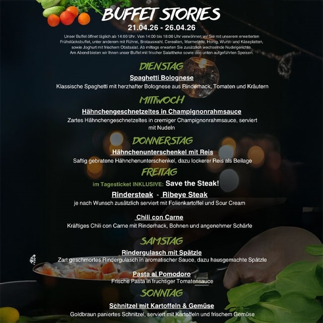 Welche Kulinarik man als Gast vom 21. bis zum 26. April 2026 im Club erleben und genießen darf, das erfährt man auf der Grafik der Buffet Stories! Da kann man nur noch Guten Appetit wünschen!