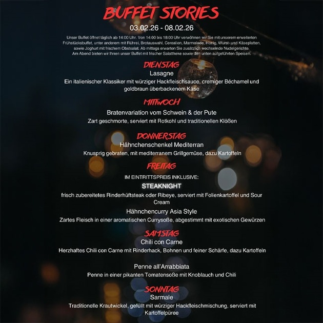 Welche Kulinarik man als Gast vom 03. bis zum 08. Februar 2026 im Club erleben und genießen darf, das erfährt man auf der Grafik der Buffet Stories! Da kann man nur noch Guten Appetit wünschen!