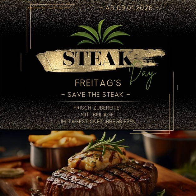 Ab sofort ist im Palmas jeden Freitag Steak Day! Im Tagesticket inbegriffen ist ein frisch zubereitetes Steak mit Beilage! Save the steak ist da die Devise!