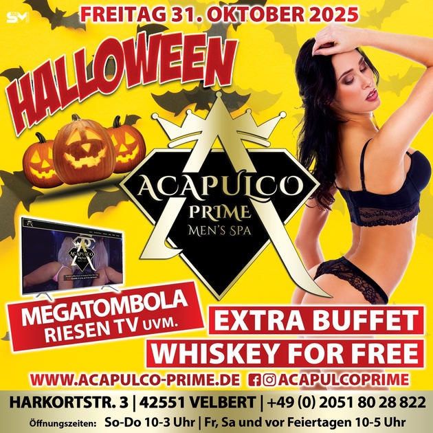 Eventankündigung: Auch am Freitag, den 31. Oktober 2025 geht es im Prime veranstaltungstechnisch wieder einmal in die Vollen, denn dann zelebriert das beliebte Velberter Men's Spa seine diesjährige Halloween Party! "Unheimlich" geil soll es an diesem Abend werden, wenn der Club die weltweit beliebte Nacht des persiflierten Horrors feiert. Und wenn sich die weiblichen Gäste des Clubs entsprechend des schauerlichen Anlasses in "Schale" schmeißen, dann denkt wohl kaum einer noch an angsteinflößende Kürbisse, sondern vielmehr an saftig schöne Melonen.