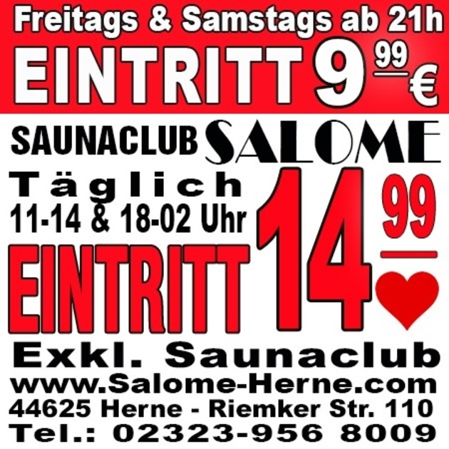 Der Eintritt in den Saunaclub Salome kostet täglich 14,99 Euro, freitags und samstags Abends ab 21:00 Uhr sogar nur schlappe 9,99 Euro! Wenn das mal kein Angebot ist!