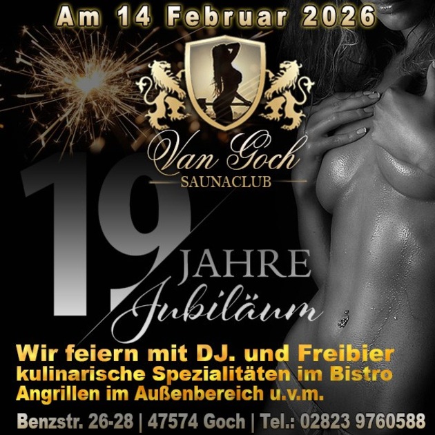 Eventankündigung: Party ist angesagt bei dieser Jubiläumsfeier zum 19. Geburtstag des Saunaclub Van Goch, die dem Gastgeber am Samstag, den 14. Februar 2026 garantiert viele Gäste beschert, denn die lieben es zu feiern und genau das propagiert das Partyprogramm. Es handelt sich hierbei um eine Party, bei der man auf Anschluss nicht lange warten muss, die Live Disco garantiert, geile Kontakte und ein Top DJ legt sich ebenfalls mächtig ins Zeugs, damit die gute Laune steht! Es gibt Freibier, kulinarische Speuialitäten im Bistro und im Außenbereich wird dann übrigens lecker angegrillt. Das sollte man sich munden lassen!