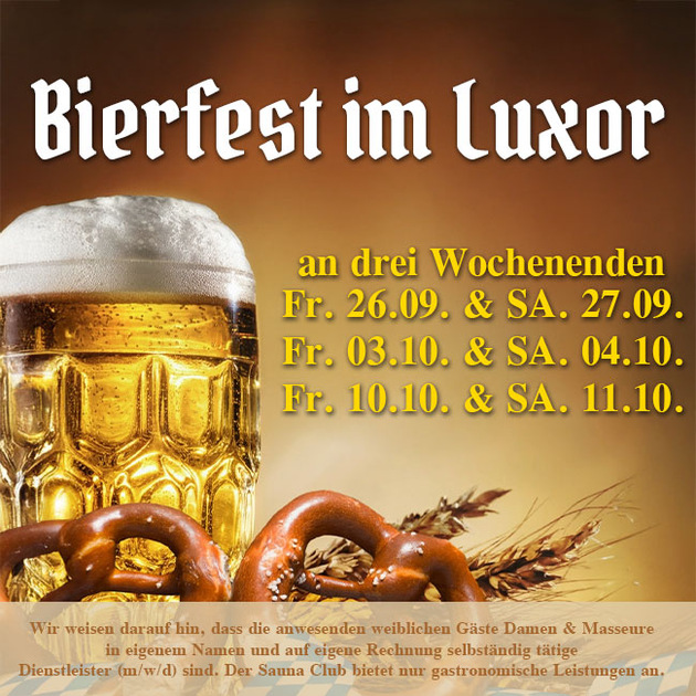Eventankündigung: Bayern, Brezeln, Bier und "Bl*smusik", das sind nur einige Beispiele, die unwideruflich zum großen Bierfest des Luxor dazugehören, das gleich an drei Wochenenden Ende September und im Oktober zelebriert wird. Und zwar jeweils Freitag und Samstag am 26. + 27.09., 03. + 04.10. sowie am 10. + 11.10, dann wird gefeiert bis die Lederhose platzt. Ein Live DJ spielt die Musi und ein jeder Gast findet dabei sein "Gschpusi", wenn er nur will…